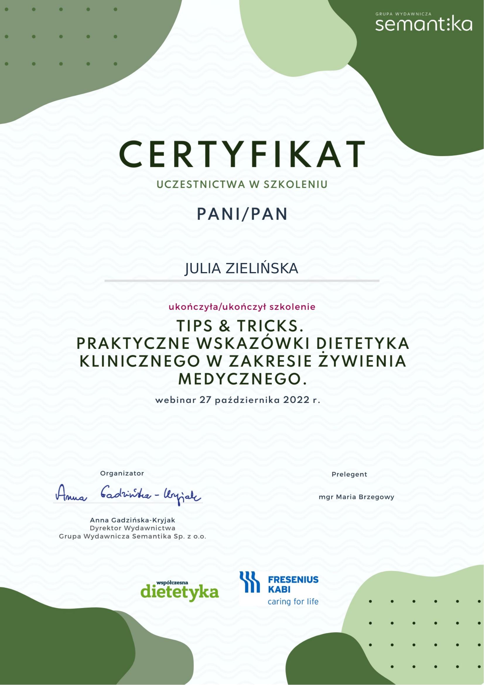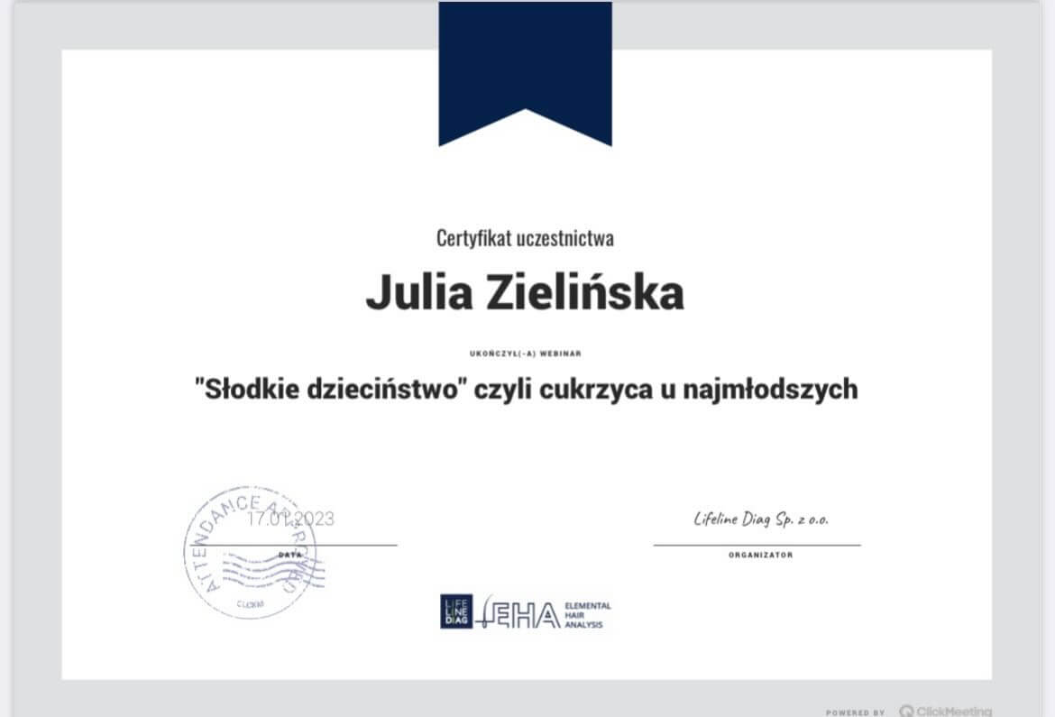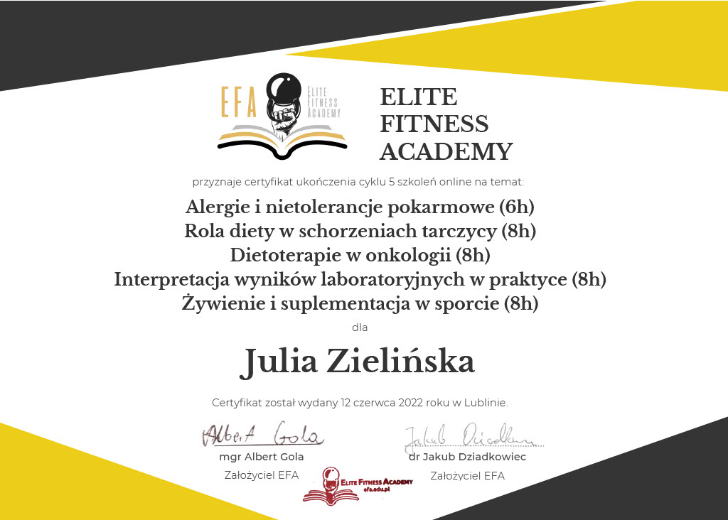 Jestem Julia, mam 22 lata i od wielu lat pasjonuję się dietetyką. Na mojej drodze do zawodu dietetyka uczestniczyłam w różnorodnych, prestiżowych kursach oraz szkoleniach, a niedawno ukończyłam kierunkowe studia licencjackie, dzięki którym uzyskałam tytuł Dietetyka klinicznego. W swoim wolnym czasie dużo gotuję i wymyślam nowe przepisy. Dodatkowo uwielbiam podróżować poznawać nowe miejsca.