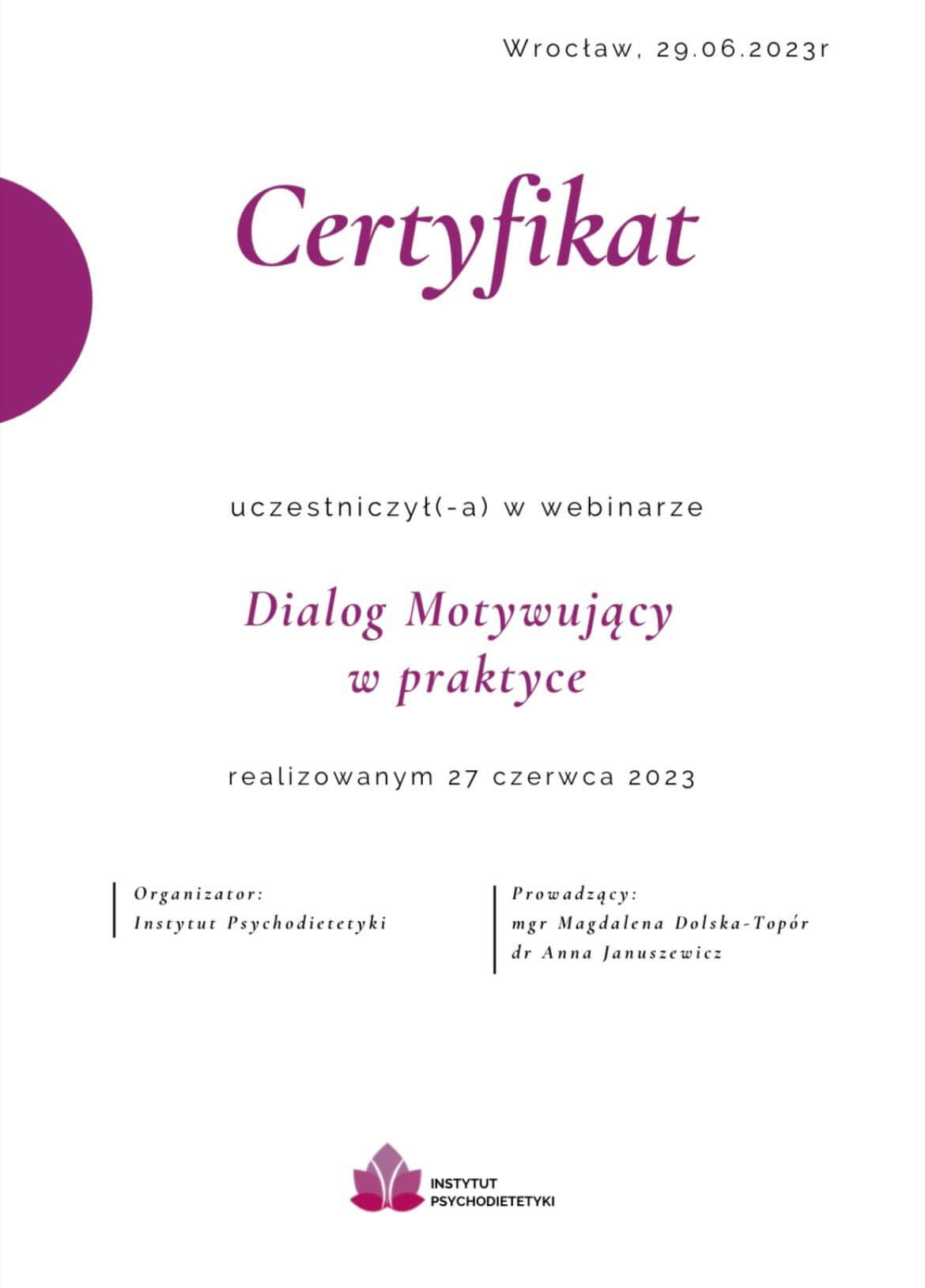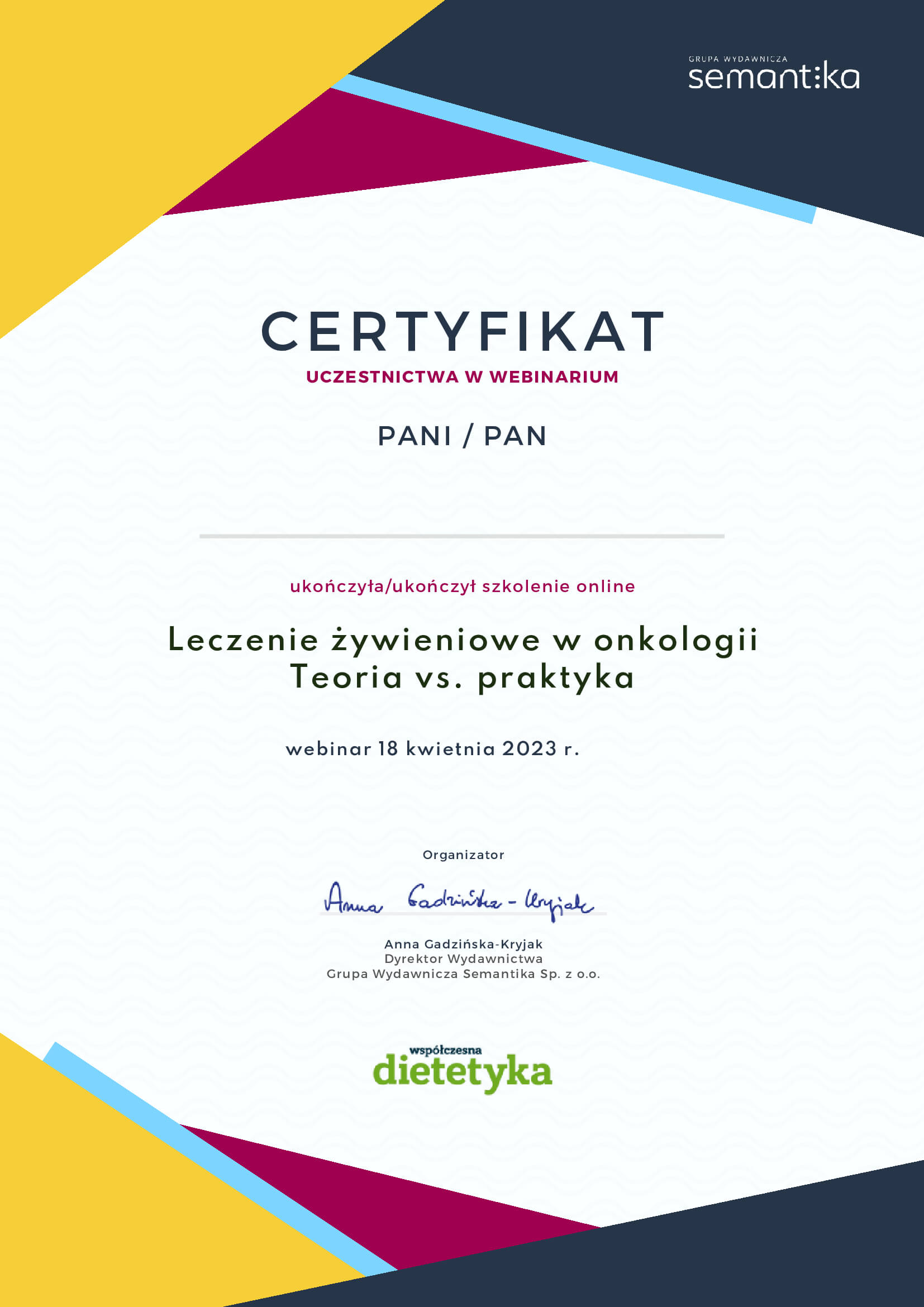 Posiadam szeroką wiedzę dietetyczną, którą nabyłam w wyniku wielu kursów oraz studiów.